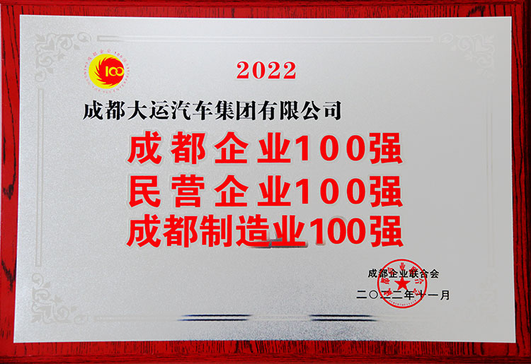 成都大運汽車集團有限公司榮獲“2022成都企業100強”榮譽稱號