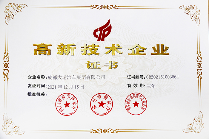 近日,成都大運汽車集團有限公司收到由四川省科學技術(shù)廳、四川省財政廳、國家稅務總局四川省稅務局聯(lián)合頒發(fā)的《高新技術(shù)企業(yè)證書》。