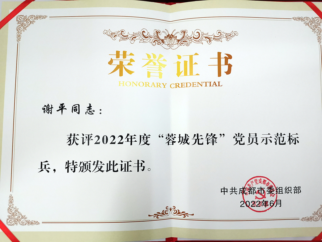 6月28日下午,由成都市委組織部舉辦的“蓉城先鋒·成都力量”——走進四川天府新區暨2022年成都市示范基層黨組織和黨員示范標兵命名儀式在公園城市首提地四川天府新區科學城舉行,公司黨委書記謝平榮獲“黨員示范標兵”殊榮。